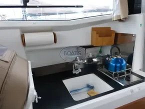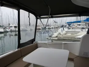 Confort à bord : Cockpit spacieux, passavants sécurisés, salon lumineux avec vue panoramique, cabine avec couchage double + salle d’eau, possibilité de couchage supplémentaire en transformant le salon.